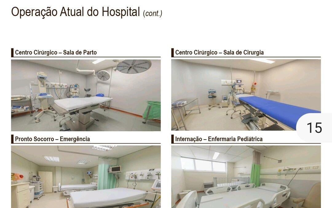 Instalações: Pronto Socorro, UTI Neonatal, UTI Pediátrica, Salas de Cirurgia e Salas Pequenas de Cirurgia.