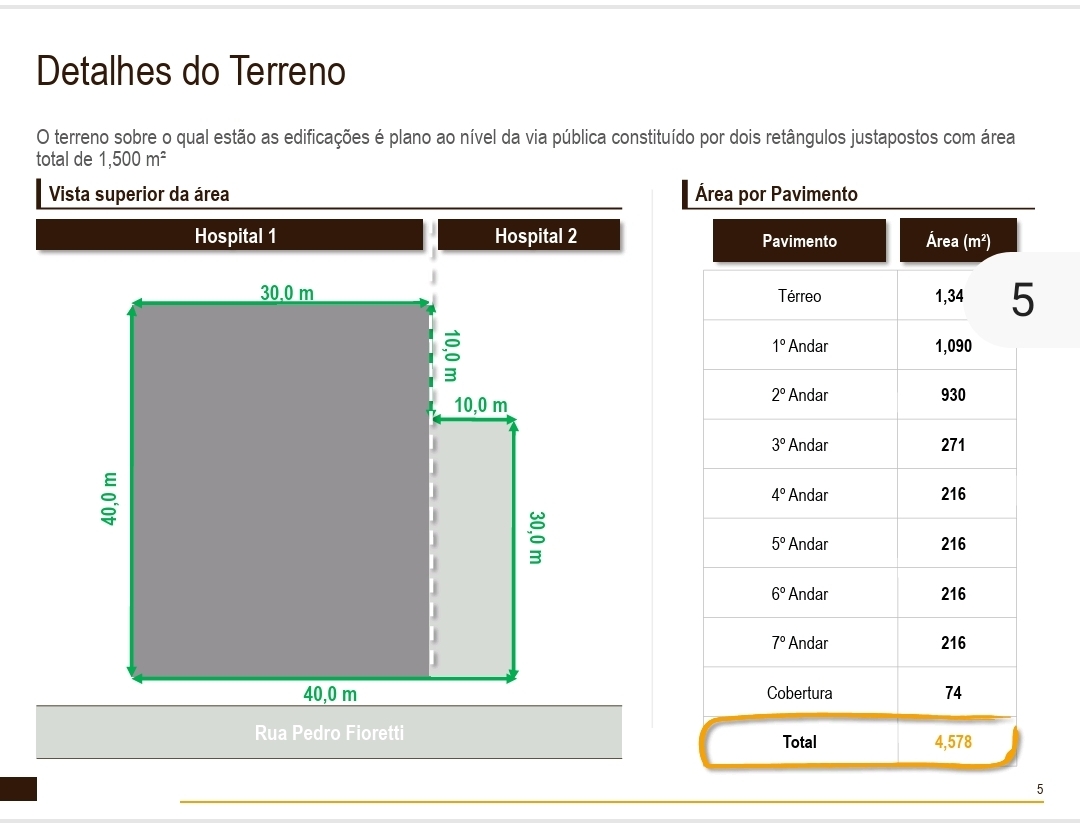 Estrutura Completa: Conjunto de dois hospitais, oferecendo um total de 77 leitos de operação em uma área total construída de 4.578 m