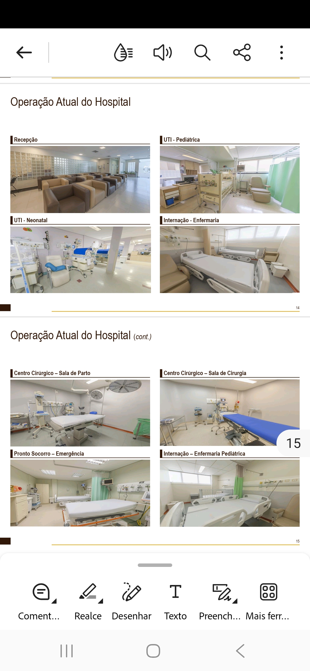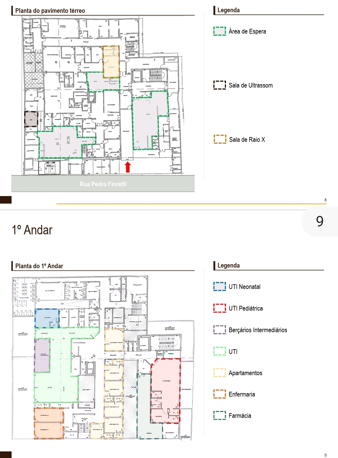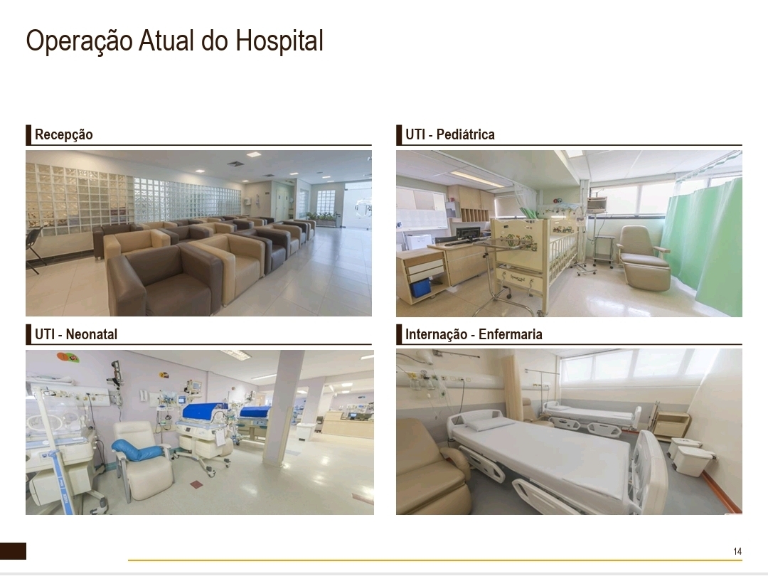 Instalações: Pronto Socorro, UTI Neonatal, UTI Pediátrica, Salas de Cirurgia e Salas Pequenas de Cirurgia.